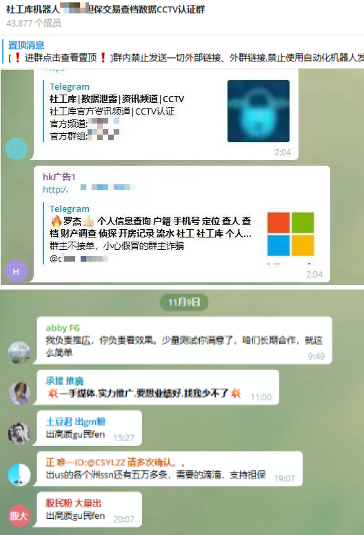 近期,記者在Telegram上一個名為“社工機器人&閑魚擔保交易查檔數據某認證群”的社交群上看到,大量的包括戶籍、手機號、定位、查人查檔、財產調查、開房記錄、流水等在內的用戶信息被公開售賣,十分猖獗。