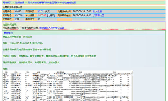 記者在暗網上看到,一份標稱剛出庫的某輔導機構全國高校93萬學生身份數據售賣,打包價格為30美元。發帖者稱,數據是網站記錄的2016年到2018年的注冊數據,里面包括姓名、手機號、學校、住址等信息。目前該數據包顯示已有18次成交。