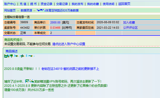 與個人隱私信息售價低廉不同的是,含賭博類會員的信息價格直線上漲。有帖主表示,某體育足球類App郵箱泄露VPN賬號密碼,除了新增2020年4月1日到2020年8月8日的注冊信息外,還更新了紅單推介會員數據,增量190萬條。值得注意的是,該數據包售價高達2000美元,已有2單成交。