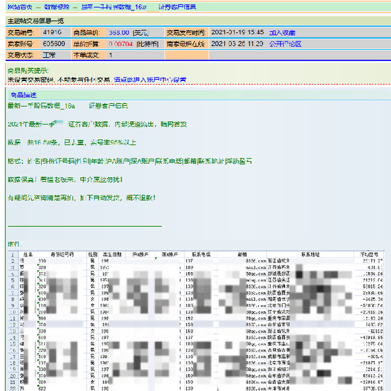 另一個在售的數據包為某證券公司多達16萬的客戶信息,標價368美元。發帖者表示,該數據為2021年最新一手客戶數據,內部渠道流出,暗網首發。“數據一共16.5萬條,已去重,實號率95%以上,數據保真。”