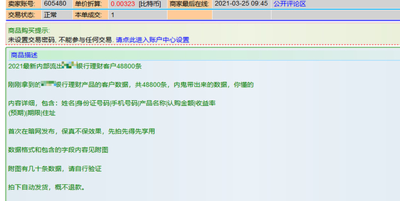交易編號為41847的帖子顯示,其擁有前述商業銀行理財客戶數據48800條。“該數據為內鬼帶出,首次在暗網發布,每份售價168美元。”發帖者稱。