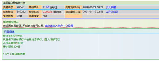 除了黑客等技術人員盜取批量信息之外,也有一些“內鬼”直接參與其中。交易編號為40046的帖子顯示:“只要提供身份證和姓名信息,便可代查名下所有銀行卡具體信息,不帶余額1100美元,結果帶余額需2200美元,1-5個工作日即可出結果。”值得注意的是,該貼自2020年8月24日發布以來,目前已交易多達360單。