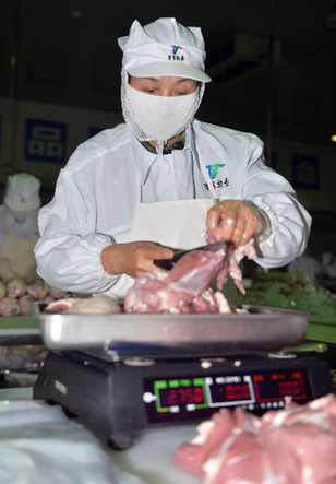 羊羊牧業(yè)的工人正在生產(chǎn)線上包裝羊肉。(資料照片)