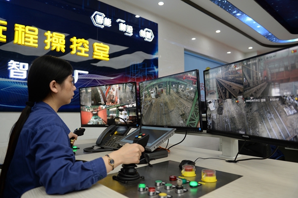 工作人員在華菱湘鋼五米寬厚板廠智慧天車遠(yuǎn)程操控室內(nèi)作業(yè)。(資料照片)新華社記者 陳振海