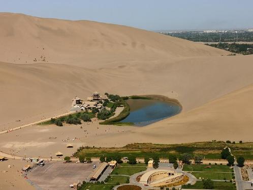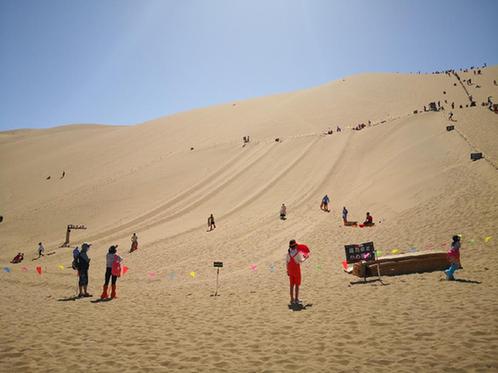 8月6日,游客在甘肅敦煌鳴沙山月牙泉景區內游玩。 受訪者供圖