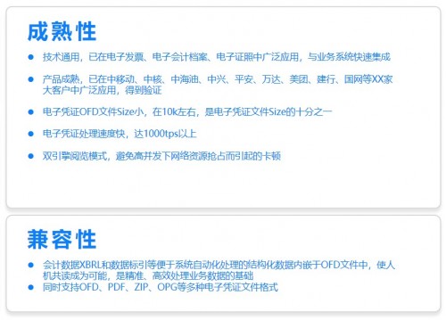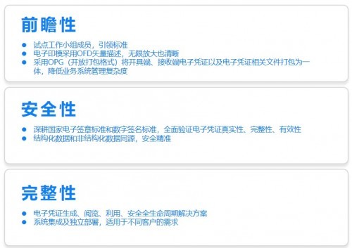 電子憑證會計數據標準是新事物,對驗簽、解析、閱讀、生成、歸檔等核心能力有硬性要求。百望云基于“XBRL+OFD+PDF+OPG”的電子憑證會計數據標準一體化解決方案,接口標準、能力全面、產品成熟,能夠快速幫助企業打通電子憑證應用及入賬報銷“最后一公里”,實現電子憑證、檔案的數字化升級。