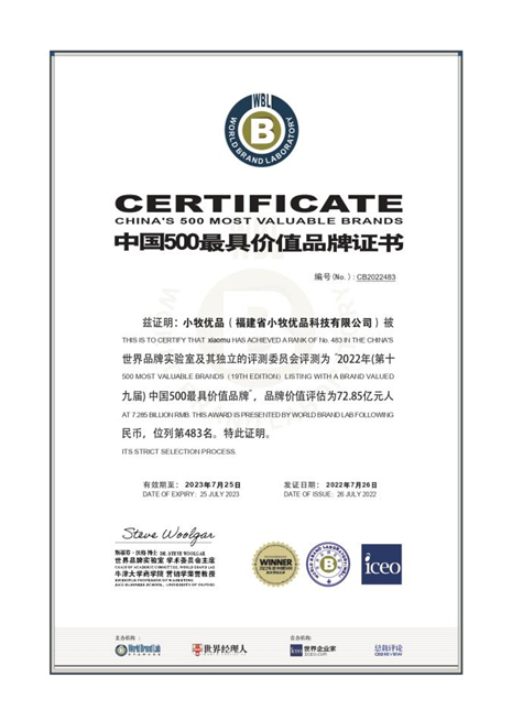 世界品牌實驗室連續19年發布的《中國500最具價值品牌》,綜合了消費者研究、競爭分析以及對企業未來收入的預測,被譽為中國品牌的”奧斯卡獎“。小牧優品第一次參評就入選”中國500最具價值品牌“,是市場對小牧綜合實力和品牌影響力的充分肯定。