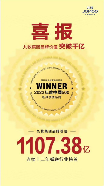 7月26日,由世界品牌實驗室(World Brand Lab)主辦的(第十九屆)“世界品牌大會”在北京舉行,大會公布了2022年《中國500最具價值品牌》分析報告,九牧集團各品牌與國家電網、海爾、騰訊、華為等品牌一同上榜中國500最具價值品牌,并以1107.38億的品牌價值領跑中國衛浴,連續12年蟬聯行業第一,行業首家品牌價值突破千億。