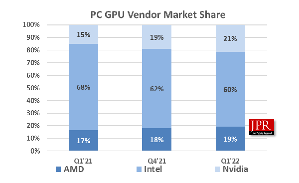 對(duì)于GPU,Intel自然是不陌生的,在PC顯卡市場上其實(shí)一直占據(jù)著領(lǐng)先地位。根據(jù)權(quán)威市調(diào)機(jī)構(gòu)Jon Peddie Research的數(shù)據(jù),2021年第一季度,Intel在PC GPU顯卡市場上的份額高達(dá)68%,2022年第一季度依然有60%。