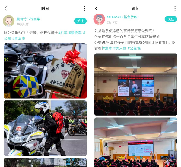 用戶(hù)@腹有詩(shī)書(shū)氣自華選擇做一位現(xiàn)代騎士,他加入了“摩托車(chē)應(yīng)急救援隊(duì)”,讓愛(ài)心馳騁在路上;@MERMAID鯊魚(yú)教練則用自己的所學(xué),給學(xué)生分享防溺安全知識(shí),守護(hù)者孩子們的健康成長(zhǎng);攝影愛(ài)好者@愛(ài)攝影愛(ài)樂(lè)山,以公益拍攝的形式,帶領(lǐng)大家走進(jìn)大山,看見(jiàn)更多渴望知識(shí)的孩子;用戶(hù)@土木人小王則用表演、陪伴,為計(jì)生特殊家庭帶來(lái)溫暖。