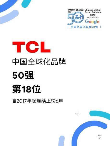 7月27日,谷歌與凱度聯(lián)合對(duì)外發(fā)布了“2022凱度BrandZ?中國(guó)全球化品牌50強(qiáng)”榜單及報(bào)告。智慧科技品牌TCL排名第18,連續(xù)六年上榜,品牌力得分614,同比增長(zhǎng)7%。