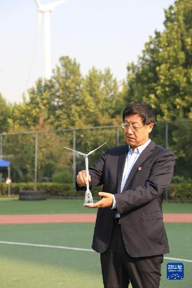 武鋼在位于北京經濟技術開發區的金風科技智慧園區內展示風機模型(2022年9月20日攝)。新華社發