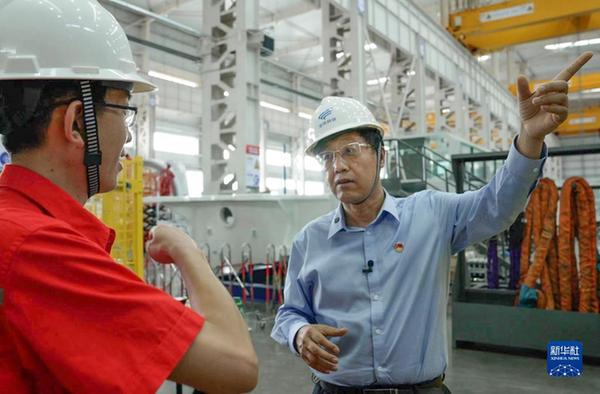 在金風科技新疆達坂城風電裝備產業基地零碳智能工廠內,武鋼(左)與技術工程師在一起交流(2022年8月6日攝)。新華社發