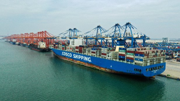 圖為貨輪停靠在廣西欽州港裝卸貨。新華社記者 張愛林 攝