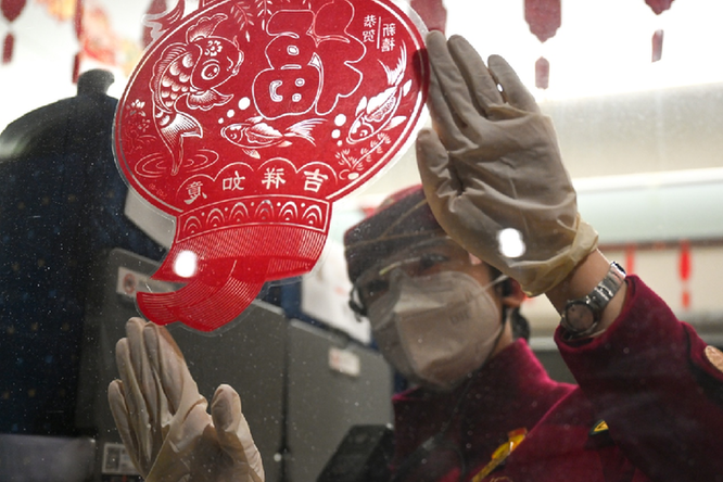 整裝待發的乘務人員佩戴手套、口罩、眼鏡的防護“三件套”迎接每一位旅客,列車長還送上了吉祥兔胸針小禮物和溫馨祝福。