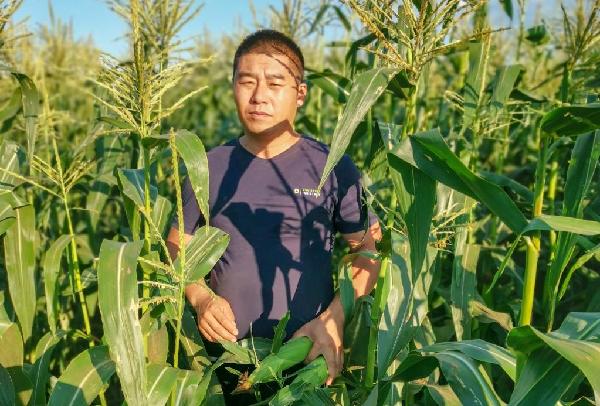 2022年7月26日,在吉林省梨樹縣北夏家村,邵亮亮檢查玉米長(zhǎng)勢(shì)。(受訪者供圖)