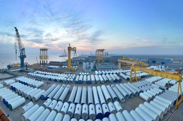 等待交付的海上風電場風機塔筒(2月7日攝,無人機照片)。