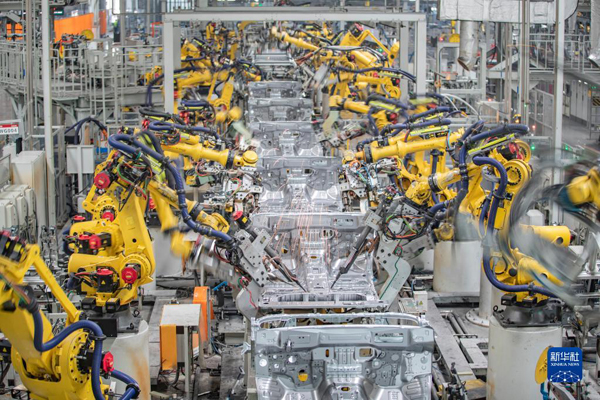 3月1日,在長城汽車重慶永川生產基地焊裝車間,智能化焊接機器人在進行焊接作業。新華社記者 黃偉 攝