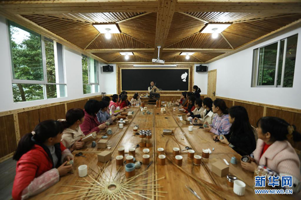 2020年11月5日,在貴州省赤水市大同鎮竹編非遺產學研基地,楊昌芹(中)在指導學員學習竹編。新華社發(王長育 攝)
