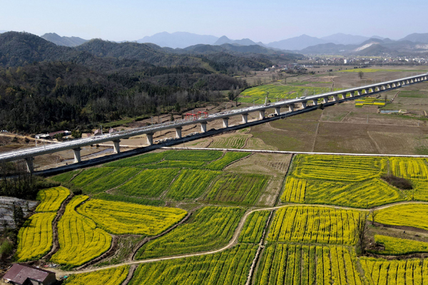 這是3月14日拍攝的中鐵十一局池黃鐵路無砟軌道施工現場(無人機照片)。