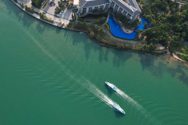 兩艘游船在博鰲東嶼島旅游度假區相向而行(3月14日攝,無人機照片)。