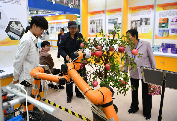 參觀者被第30屆楊凌農高會上的一款采摘機器人吸引。