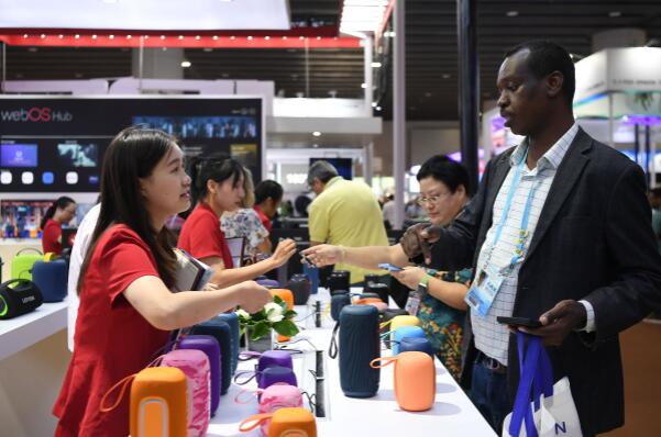 在第134屆廣交會(huì)上,來自蘇丹的采購(gòu)商在智能音箱展臺(tái)洽談。新華社記者 鄧華 攝