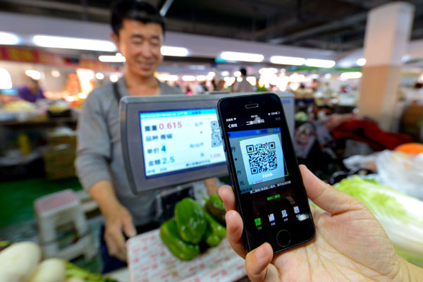 在河北省邯鄲市一家便民市場,消費者在掃碼支付購買蔬菜。