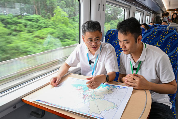圖為當日,中鐵第一勘察設計院集團有限公司廣佛南環總設計師韓振江(左)介紹剛剛投入運營的廣佛南環、佛莞城際鐵路的設計思路。記者 劉大偉 攝