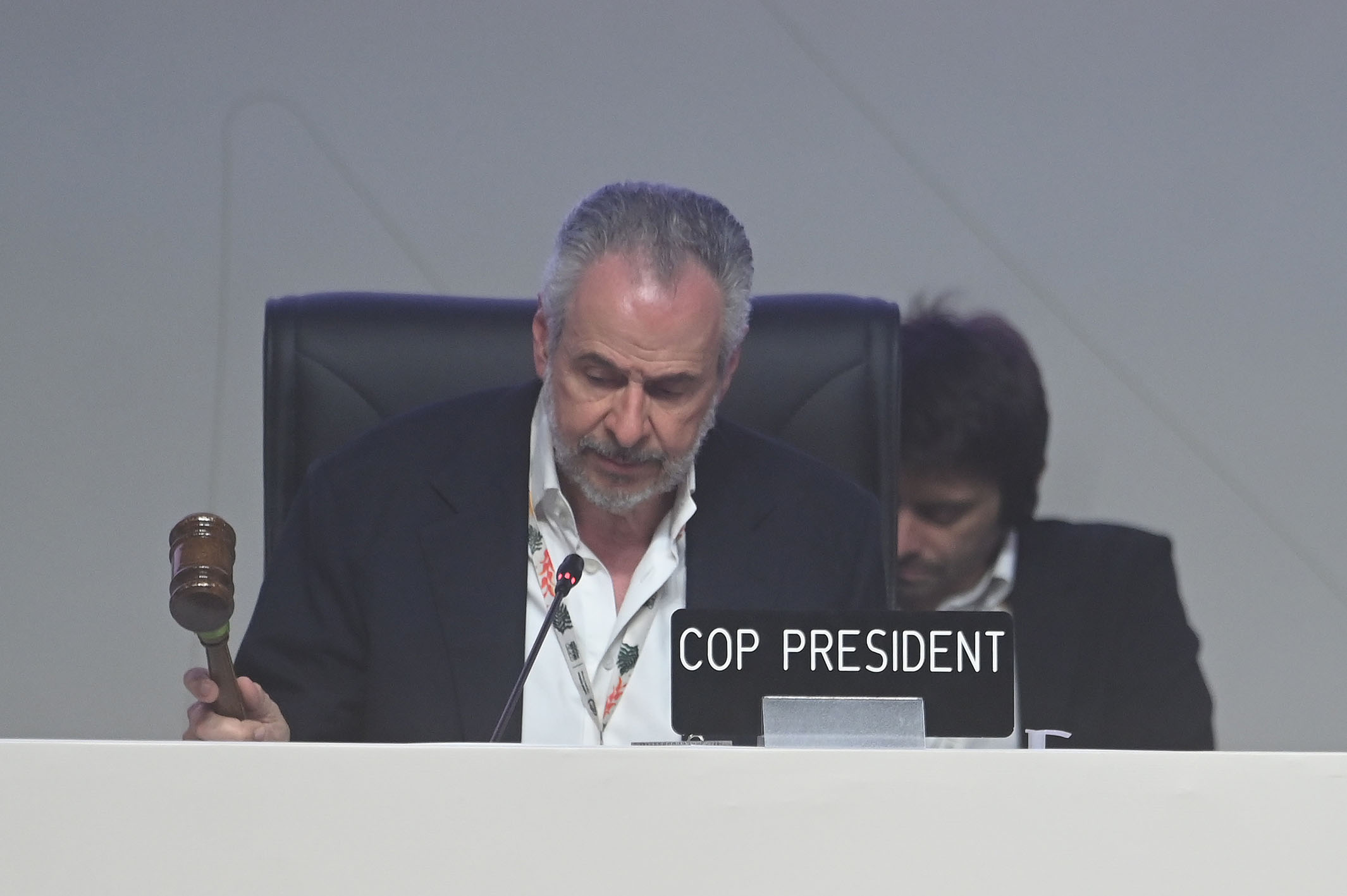 圖為在《聯(lián)合國氣候變化框架公約》第三十次締約方大會(huì)上,大會(huì)主席多拉戈敲槌確認(rèn)會(huì)議決定。新華社發(fā)(盧西奧·塔沃拉 攝)