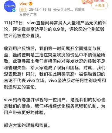 聲明稱,11月29日,vivo直播間異常涌入大量和產品無關的評論,評論數量高達平時的8.9倍,評論區(qū)的個別詆毀性評論被意外置頂。