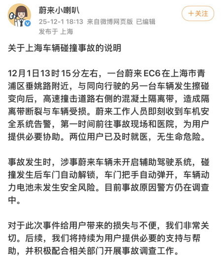 12月1日18時許,蔚來汽車官方辟謠微博號“蔚來小喇叭”發(fā)布事故說明:12月1日13時15分左右,一臺蔚來EC6在上海市青浦區(qū)垂姚路附近,與同向行駛的另一臺車輛發(fā)生擦碰變向后,高速撞擊道路右側(cè)的混凝土隔離帶,造成隔離帶斷裂與車輛受損。蔚來工作人員即刻收到車機(jī)安全系統(tǒng)告警,第一時間前往事故現(xiàn)場和醫(yī)院,為用戶提供必要協(xié)助。兩位用戶已及時就醫(yī),無生命危險。
