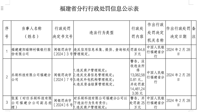 記者還注意到,樂刷支付曾被中國人民銀行福建省分行處以高達2754.38萬元的罰款。中國人民銀行福建省分行行政處罰決定顯示,2024年2月28日,樂刷支付福建分公司因違反商戶管理規定、違反交易信息管理規定、違反外包機構管理規定、違反資金結算管理規定,被給予警告,沒收違法所得1308.26萬元,并處罰款1446.12萬元,合計罰沒約2754.38萬元。