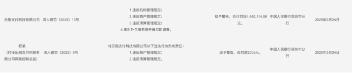 此前,3月24日,根據中國人民銀行深圳市分行另一行政處罰決定,樂刷支付因違反機構管理規定、違反商戶管理規定、違反清算管理規定,以及未對外包服務商開展盡職調查,被給予警告,并合計罰沒445萬元。