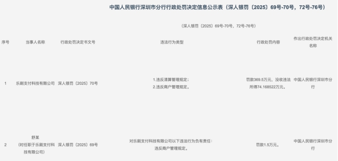 處罰信息顯示,樂刷支付因違反清算管理規定和違反商戶管理規定,被處以罰款369.5萬元,并沒收違法所得74.168522萬元。同時,時任職于該公司的舒某對上述違反商戶管理規定的行為負有責任,被處以1.5萬元罰款。