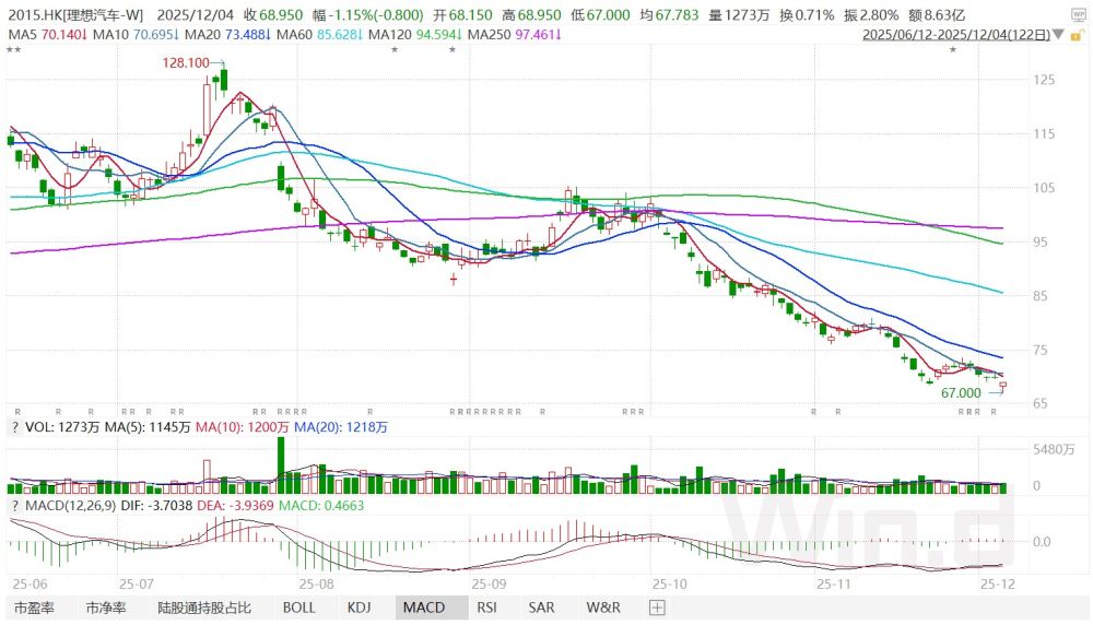 圖:理想汽車近期股價持續下跌 資料來源:Wind