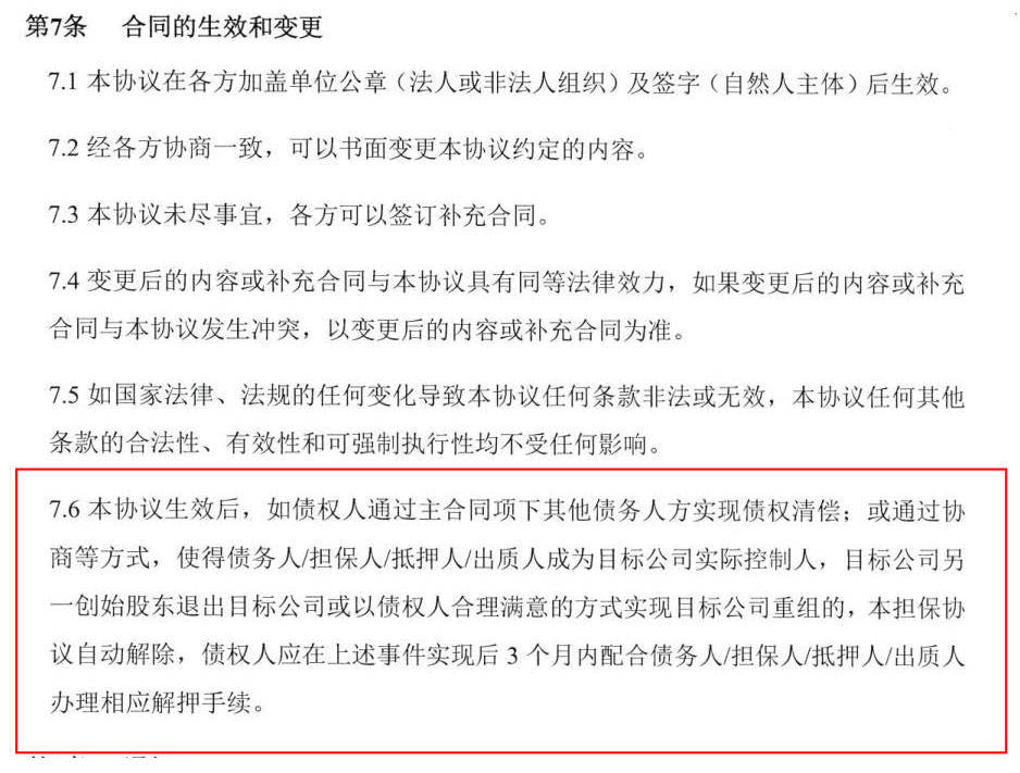 二是合同的生效和變更。該協議第7.6條載明:該擔保協議生效后,如債權人通過主合同項下其他債務人方實現債權清償;或通過協商等方式,使得債務人/擔保人/質押人/出質人成為目標公司(指駿玖電子)實際控制人,目標公司另一創始股東退出目標公司或以債權人合理滿意的方式實現目標公司重組的,本擔保協議自動解除,債權人應在上述事件實現后3個月內配合債務人/擔保人/質押人/出質人辦理相應解押手續。