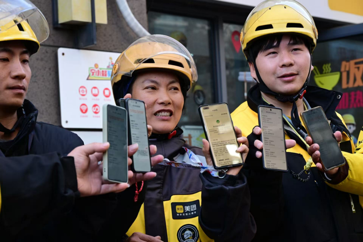 2025年12月10日,江蘇南京,騎手們展示收到社保補貼的手機頁面信息。李碩 攝
