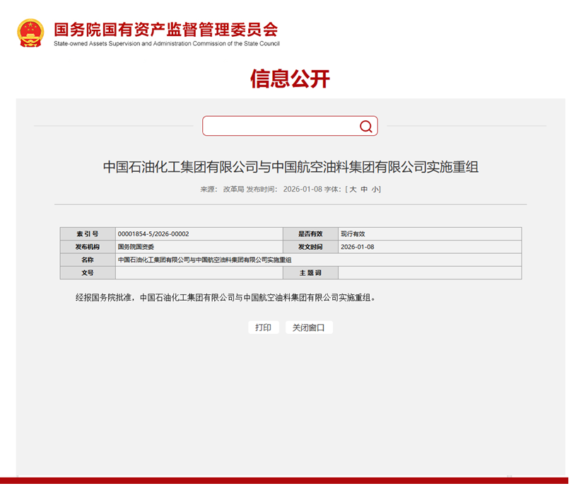 1月8日國務院國資委消息顯示,經報國務院批準,中國石油化工集團有限公司(下稱“中國石化”)與中國航空油料集團有限公司(下稱“中國航油”)實施重組。