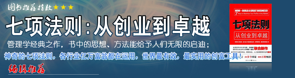 | 在《七項法則》中,印象最深刻的是“逆風險營銷”,這個思路讓我對目前正困惑的一個項目,有豁然開朗的感覺。它能指導人如何更好地創(chuàng)業(yè)、管理公司、更好地工作。 |