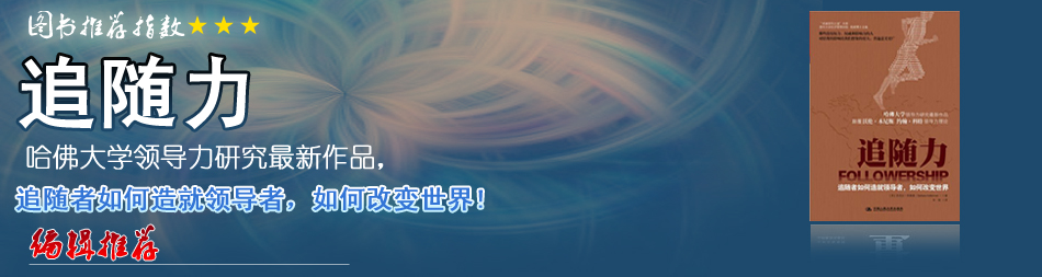 | 這是一本關于領導學的書。作者芭芭拉·凱萊曼在前人研究的基礎上,將追隨者分為孤立型、旁觀型、參與型、主動型和頑固型5種類型,涵蓋了從完全置身事外的追隨者到深深承諾、全心參與的追隨者,并總結出5種類型追隨者的行為特征,指出領導力和追隨力可以基于相互尊重和信任而產生一種共生關系,優秀領導的職責是使其追隨者更加積極、有創造性,在需要的時候能夠提出建設性的對策。 |