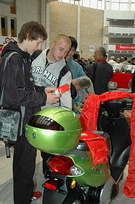 | 在俄羅斯西南部城市沃羅涅日舉行的重慶商品展上,俄羅斯觀眾被重慶生產的摩托車吸引。新華社記者 劉軼芳