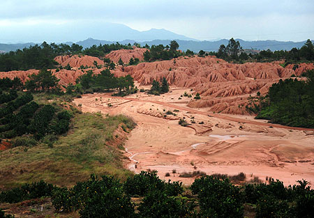 稀土開發留下的尾砂山 在江西省信豐縣水土保持教育基地,因稀土開發留下的寸草不長的尾砂山和周圍綠意蔥蘢的橙園形成對比(10月24日攝)。上世紀80年代,這里的稀土礦區新增水土流失面積24.68平方公里,排放尾砂近6000萬噸,尾砂山成了“江南沙漠”。 記者