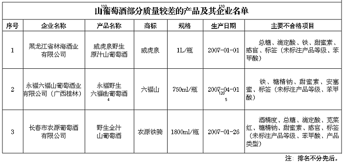 日前,國家質檢總局在對山葡萄酒產品質量的抽查中,共檢查了吉林、遼寧、黑龍江、廣西等四個省、自治區50家企業生產的50種產品(不涉及出口產品),產品實物質量合格率為88%。 此次抽查對山葡萄酒產品的酒精度、總糖、滴定酸、揮發酸、游離二氧化硫、總二氧化硫、干浸出物、鐵、大腸菌群、細菌總數、腸道致病菌、鉛、莧菜紅、胭脂紅、山梨酸、苯甲酸、糖精鈉、甜蜜素、安塞蜜、感官以及標簽等21個項目進行了檢驗。 抽查結果表明,一是連續多年的國家監督抽查促進了企業質量意識的提高,此次產品抽樣合格率比上次提高了12個百分點;二是所檢產品衛生指標中的大腸菌群、細菌總數、腸道致病菌項目全部合格。 抽查中發現的主要質量問題: